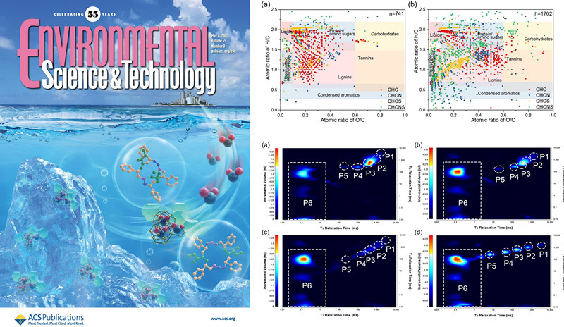 二氧化碳海洋封存过程将伴随潜在的局部海水酸化,该过程将导致酸性可溶有机质(Acid-DOM)的溶解。研究通过对海洋黏土水提取物、酸提取物的光谱和能谱对比分析发现,酸提取物中有机物种类是水提取物中的2倍以上,且酸提取物中含硫有机化合物(主要来自不饱和烃和木质素,如烷基苯磺酸盐)显著增加。对多孔介质内水合物生成富集过程进行原位跟踪发现,酸性可溶有机质能够显著促进水合物生成速率和转化率,突破客体分子传质阻力,降低孔隙富集非均质性,有效提升碳封存能力;同时酸性可溶有机质的存在能够增强微孔内自由水的转化,进而提升水合物与周围颗粒的胶结程度,提高沉积物的刚度和强度,降低水合物形态碳封存过程诱发海底滑坡坍塌等地质灾害的风险。相关成果以主封面论文形式发表在Environmental Science & Technology上(Vol.55, 2021)。