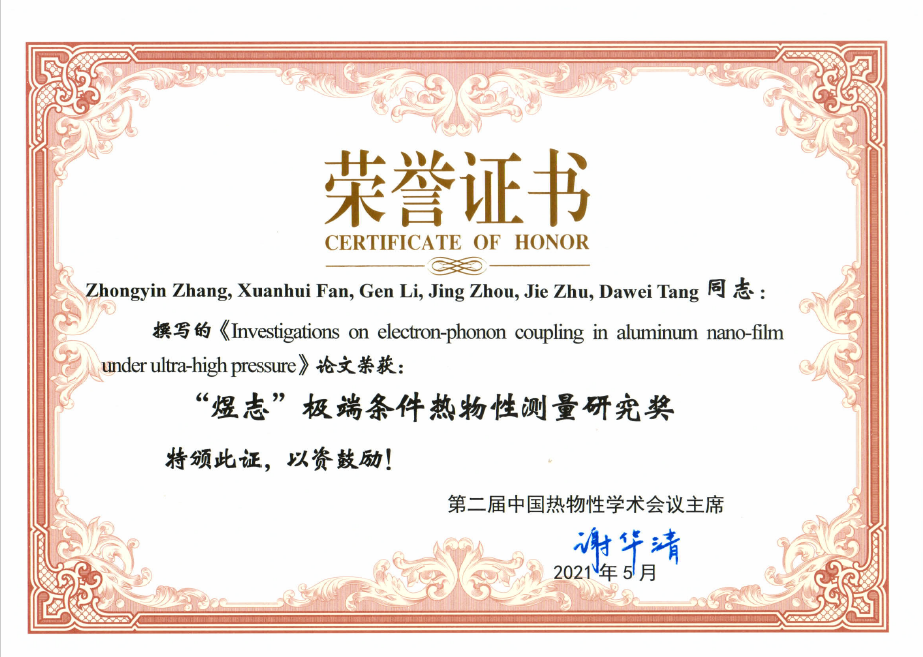 张中印博士的工作《Investigaitons on electron-phonon coupling in aluminum nano-film under ultra-high pressure》通过结合时域热反射法和金刚石对顶砧技术,首次从实验上观测了超高压下金属纳米薄膜的电声耦合过程,获得电声耦合系数的压力依赖性,并从带内跃迁的角度对实验结果进行了很好的解释,为揭示高温超导机理以及高功率电子芯片、自旋电子器件的设计提供了科学依据。该工作得到了与会专家的充分肯定,最终获得了《“煜志”极端条件热物性测量研究奖》。本次获奖充分体现了热物性研究领域对有爱爱