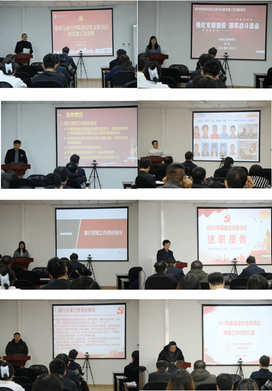 会议采取现场述职和书面述职相结合的方式进行。七名教工党支部书记围绕本支部一年来在履行党建工作责任、落实党建工作重点任务、推进“一融双高”建设、上年度述职查摆问题整改落实和本年度存在问题和改进思路举措等方面的工作进行了详细阐述。全体党支部书记述职总结了2023年党支部党建工作情况,并对2024年党建工作提出谋划方向。