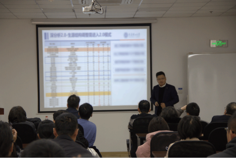 李琳副处长围绕本科生生源质量提升为核心,介绍当前各所985大学在各省份、各专业的招生录取情况,结合历年招生数据进行分析后发现提升生源质量的任务迫在眉睫,需采用优化总体布局战略、提高宣传针对性等方式,投入更专业的人员、更专业的力量及更专业的政策才能有效提升我校生源位次;李琳副处长对学院总体招生宣传工作表示肯定,结合个人思考为学院招生工作组人员在今后的招生宣传工作提出指导建议。