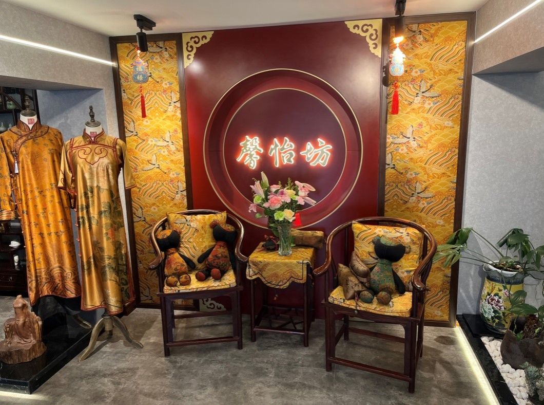 在悠扬的乐曲中,女教师们近距离感受现场展示旗袍制作的“镶、嵌、滚、岩、盘、绣”。女教师们相聚“馨怡坊”,座谈、交流、愉悦身心,尽情展示女性之美。