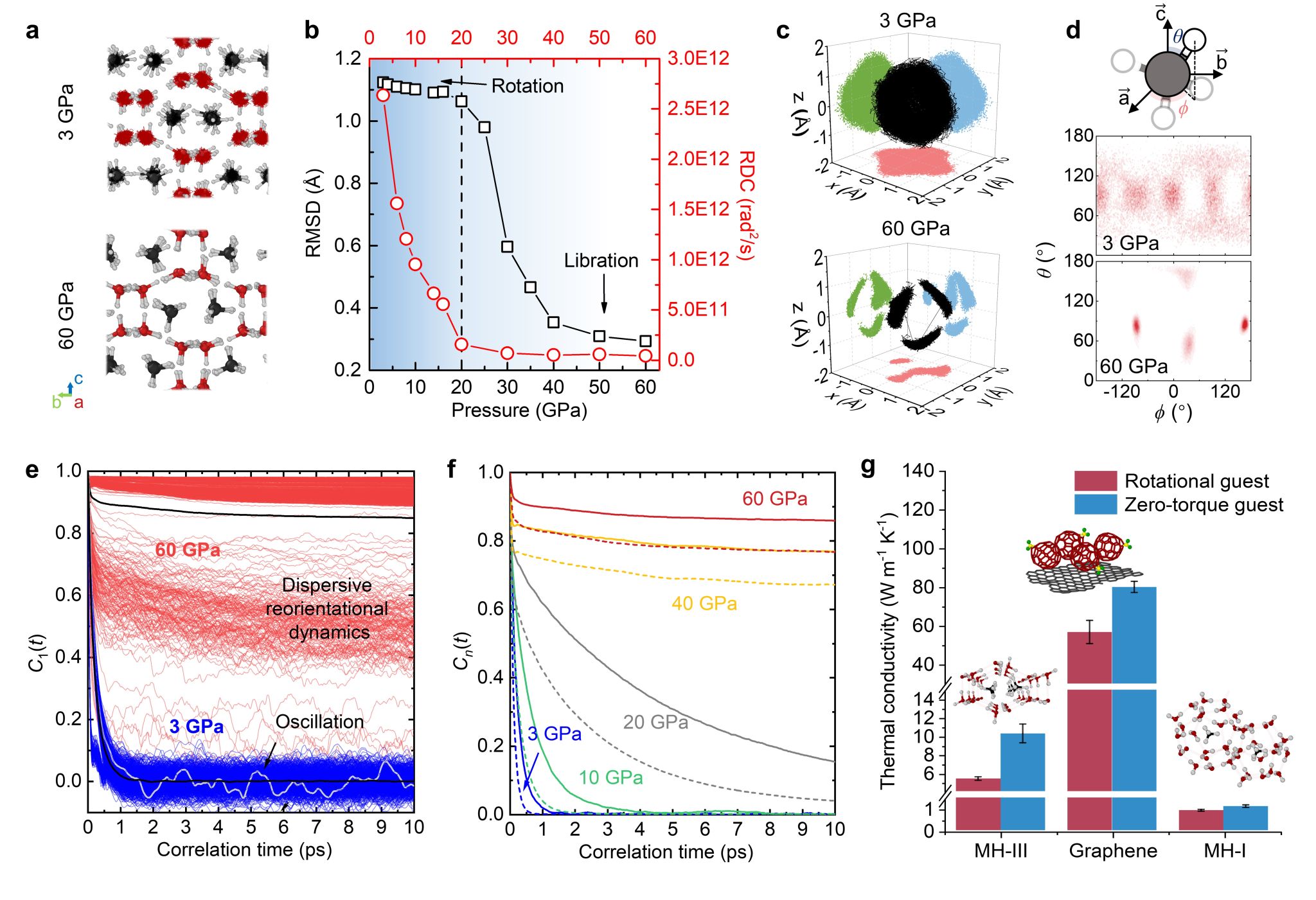 研究团队从天然气水合物(可燃冰)独特的主-客体结构中获得灵感,提出了利用客体分子旋转增强晶格混乱度,并通过强化主-客体耦合以有效降低晶体热导率方法。通过晶格压缩(3~60 GPa)实现了填充冰甲烷水合物(MH-III)中客体分子旋转动力学的灵活调控,系统揭示了客体混乱旋转对晶体热输运的影响规律和物理本质。通过巧妙构建分子模型,发现了客体分子旋转与主体水晶格振动的强耦合,可以引发声子散射和声子局域化,实现近3倍的热导率抑制。同时,通过对比二维层状石墨烯-富勒烯异质结和sI型甲烷水合物(MH-I)等体系,系统验证了这一机制在一维通道、二维层状以及三维笼型结构中的普适性,提出了通过主-客体耦合强度控制,灵活调控分子晶体热导率的创新策略。上述研究为认识与调控复杂材料热输运特性提供了新的理论依据和方向。