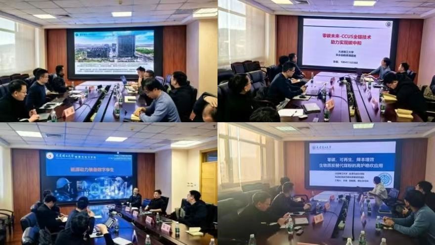 张长亮主任介绍了学校产学研合作现状;芮嘉敏主任介绍了长三角国创中心概况;朱鑫部长介绍了沿海可再生能源开发利用现状与前景;鲁业明介绍了学院科研概况。张毅、王储、连志强、耿铁依次介绍了CCUS全链技术、生物质替代煤粉、风电装备智能运维、风浪联合深水实验室建设进度。