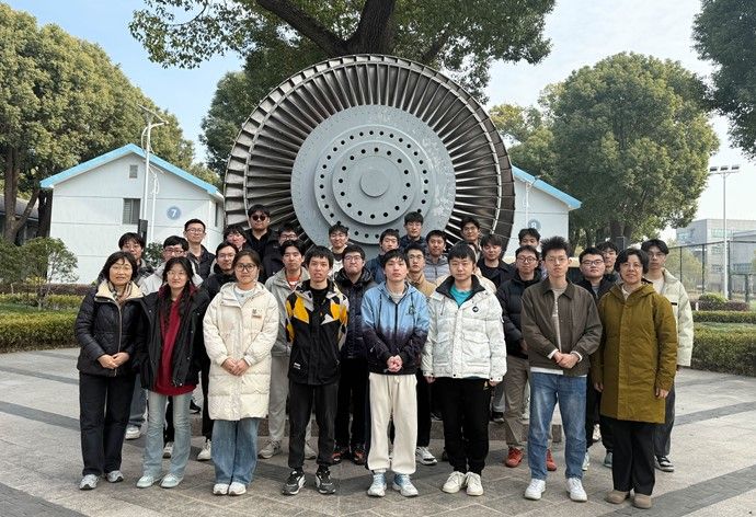 实习队伍前往上海电气汽轮机厂。上海汽轮机厂是拥有70年装备制造底蕴的市属国企,从事火电汽轮机及燃气轮机、核电汽轮机、工业透平、氢能及储能设备的产品研发、制造及智能服务。工厂坐落于上海市闵行区,年营业收入60亿元,年产量3000万千瓦,国内市场占有率第一。百万千瓦超超临界二次再热汽轮机等产品代表全球最高效率、最领先技术。先后与美国西屋、德国西门子、意大利安萨尔多开展汽轮机和燃气轮机方面的合资合作,拥有“全国先进基层党组织”“全国文明单位”等荣誉称号。
