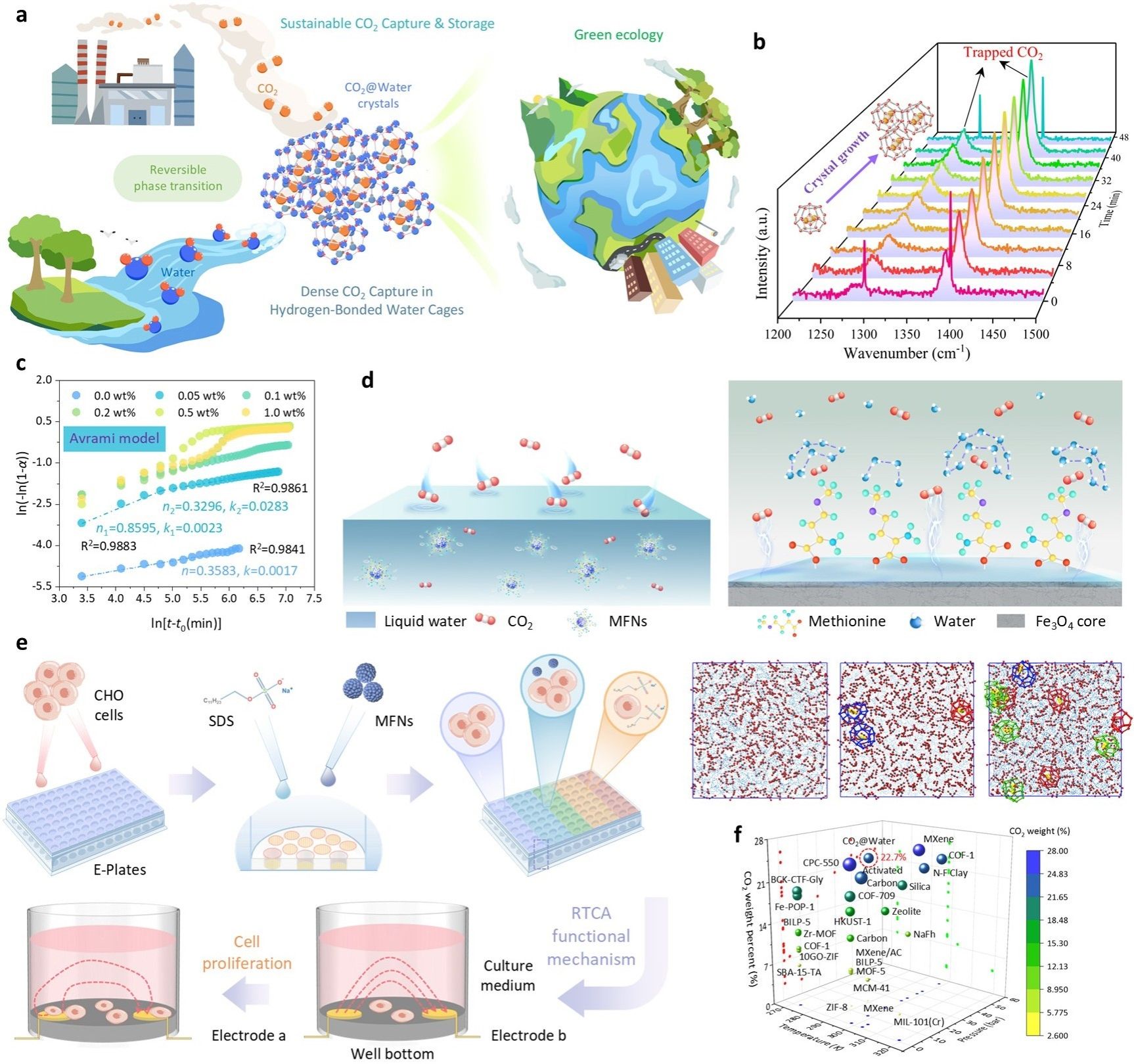 图 有机超顺磁纳米粒子强化水合结晶氢键纳米笼中二氧化碳捕集。(a)基于氢键纳米水笼中二氧化碳可持续捕集概念;(b)碳捕集纳米笼动态特征;(c)碳捕集动力学模型;(d)水分子有序化过程;(e)实时无损生物相容性研究;(f)氢键水笼碳捕集分子模拟及性能比较。